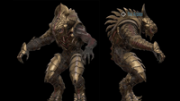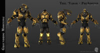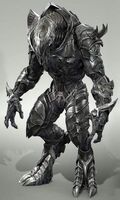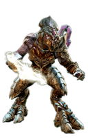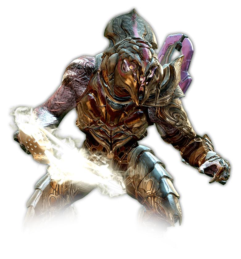The Arbiter is a member of the Sangheili alien race, somewhat reptilian creatures who tower over humans with their large height and armored flesh. As a Sangheili, he possesses scaly, dark brown skin, piercing yellow eyes, four mandible-like lips around his mouth, two fingers and two thumbs on each hand (similar to Glacius's race), and digitigrade legs and feet. He is equipped with a custom brown, grey, and gold suit of battle armor known as the Kaidon armor with an ornate helmet and one sleeveless arm, and most often wields a customized Energy Sword known as "Prophet's Bane", a Type-51 Carbine, and a set of Plasma Grenades - traditional weaponry for the Arbiters of the Covenant, although the Prophet's Bane is unique to the most recent Arbiter, Thel 'Vadam.