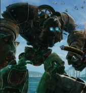 During an Ultra Combo, large chunks of metal are sent into the sea in the background, which creates a gigantic, metallic golem near the shore and another smaller one in the distance.
