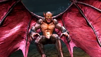 In Killer Instinct (2013), Gargos features a far more diabolical appearance. He now has reddish-purple skin, but also a tan chest and horn-like protrusions on his arms. His face undergoes a drastic redesign, giving him curled ram horns reminiscent of the Satanic idol Baphomet, with blank green eyes, bared fangs, no nose, and tusks jutting out from the sides of his lipless mouth. He has digitigrade legs with two large claws on each foot. His wings appear torn and tattered and emanate a green aura from the ends.