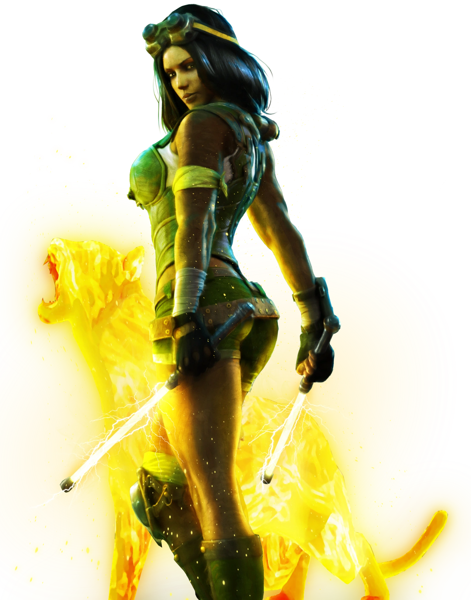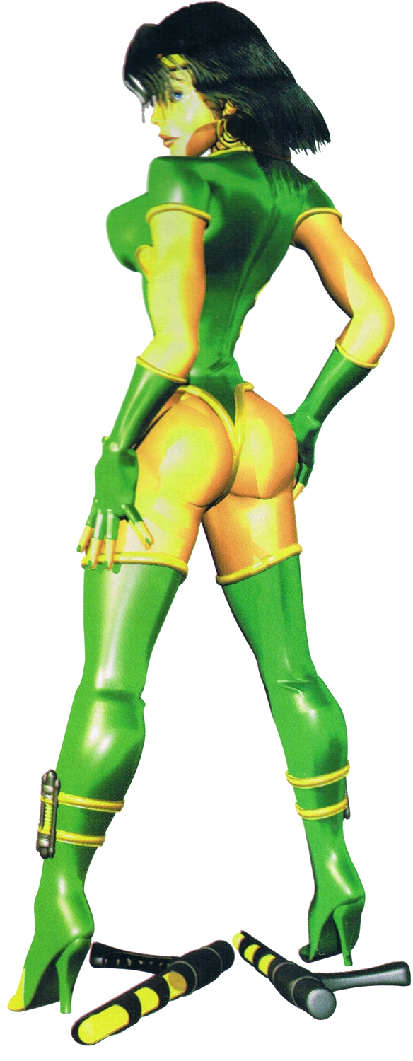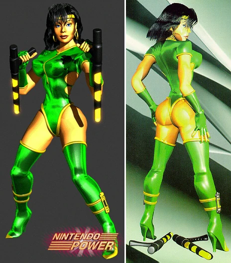 In Killer Instinct 2, the Black Orchid receives a pretty noteworthy aesthetic redesign that prominently features a thonged green bodysuit with yellow highlights. This (thonged) bodysuit shows part of her tanned skin through oval-shaped openings on each side of the chest and abdomen, and then cuts off sharply as a "V" shape in between Orchid's (flawless) thighs, unapologetically revealing her (perfectly) voluptuous hips/glutes to the world. Her high-heeled boots extend right up to the thighs, and her eskrima sticks are replaced with electrified tonfas. Orchid's hairstyle is also more curly than before, and she wears a pair of large gold earrings.