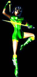 In Killer Instinct (1994), B. Orchid is a prime and athletic young woman with tanned skin, raven black hair, and breasts so big and perky that one look from any man would give them Stendhal's syndrome everytime she flashes them, even if it's her brother Jago. Her costume consists of a green leotard with the word "HOT" written on each side in capital yellow letters. The ends of the leotard show yellow linings around her thighs, and she wears green gloves and high-heeled, ankle-length boots. The boots also have yellow cut-offs, and feature reserve weapons strapped to them. Orchid wears a green and yellow headband and she wields two plasma-based eskrima sticks.