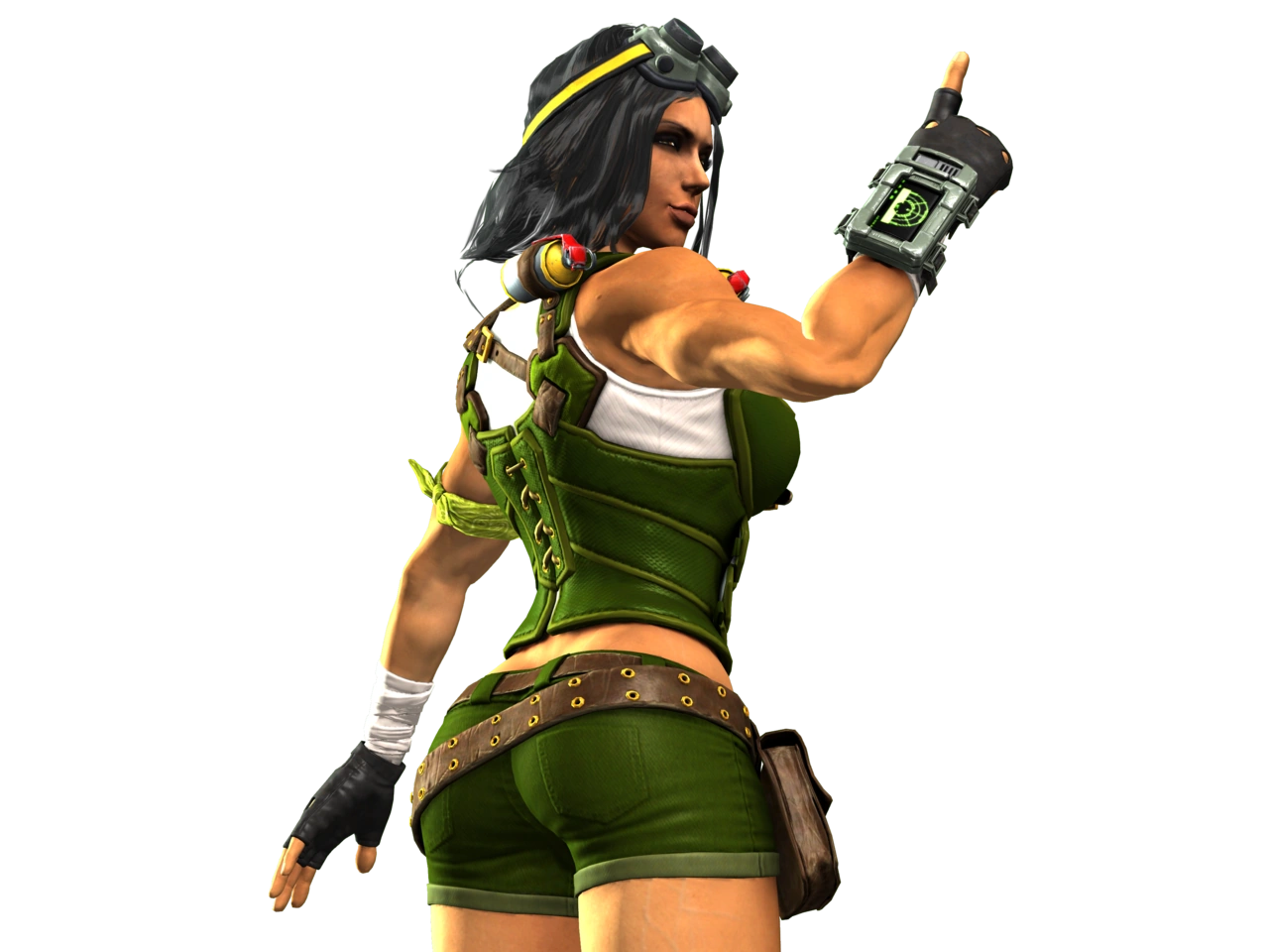 In Killer Instinct (2013), B. Orchid's appearance reflects her secretive background in the US special forces while still accentuating her body's top athletic figure. Her iconic yellow headband has nightvision goggles added, and she features a green armored bustier over a white top, green shorts with a belt around them and black cut-off gloves, while on her left upper arm she has a green strap of cloth wrapped around her biceps. Bandages are wrapped around her wrists and a mini-computer is strapped to her right wrist. She wears a single shin-guard on her right knee along with another strap of cloth, and features ankle high, high-heeled combat boots. Orchid again uses her eskrima sticks seen in the 1994 game.