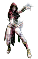 Sadira is an acrobatic fighter who was trained in muay boran boxing during her time in a refugee camp as a child, battering her opponents with swift strikes from every direction, mainly in the form of kicks. She especially excels in aerial combat, which can easily be seen due to the fact that she was the first character in Killer Instinct to have an air combo mechanic. She also wields bladed arm bracers which she can use to slash opponents, along with a set of throwing knives. When her Master's necklace burrowed into her heart it gave her the ability to create and manipulate spider silk from within her body, letting her summon spiderwebs and attach her throwing knives to long strings of silk.