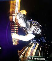 Shin Hisako is almost identical to Hisako, but with some drastic changes. She now wears the signature sode shoulder armor and suneate shin guards of a samurai, combined with a black and gold dress and a yellow flower attached to her hair. Her eyes are now bright gold, same goes for her aura to symbolize her purged spirit. No longer an onryō spirit, gone is the cursed dagger filled maw; her mouth and teeth now appear human. Discarding her late father's naginata, she now wields his katana which contains a coalesced Guardian assigned to help her in her duties as a gatekeeper.